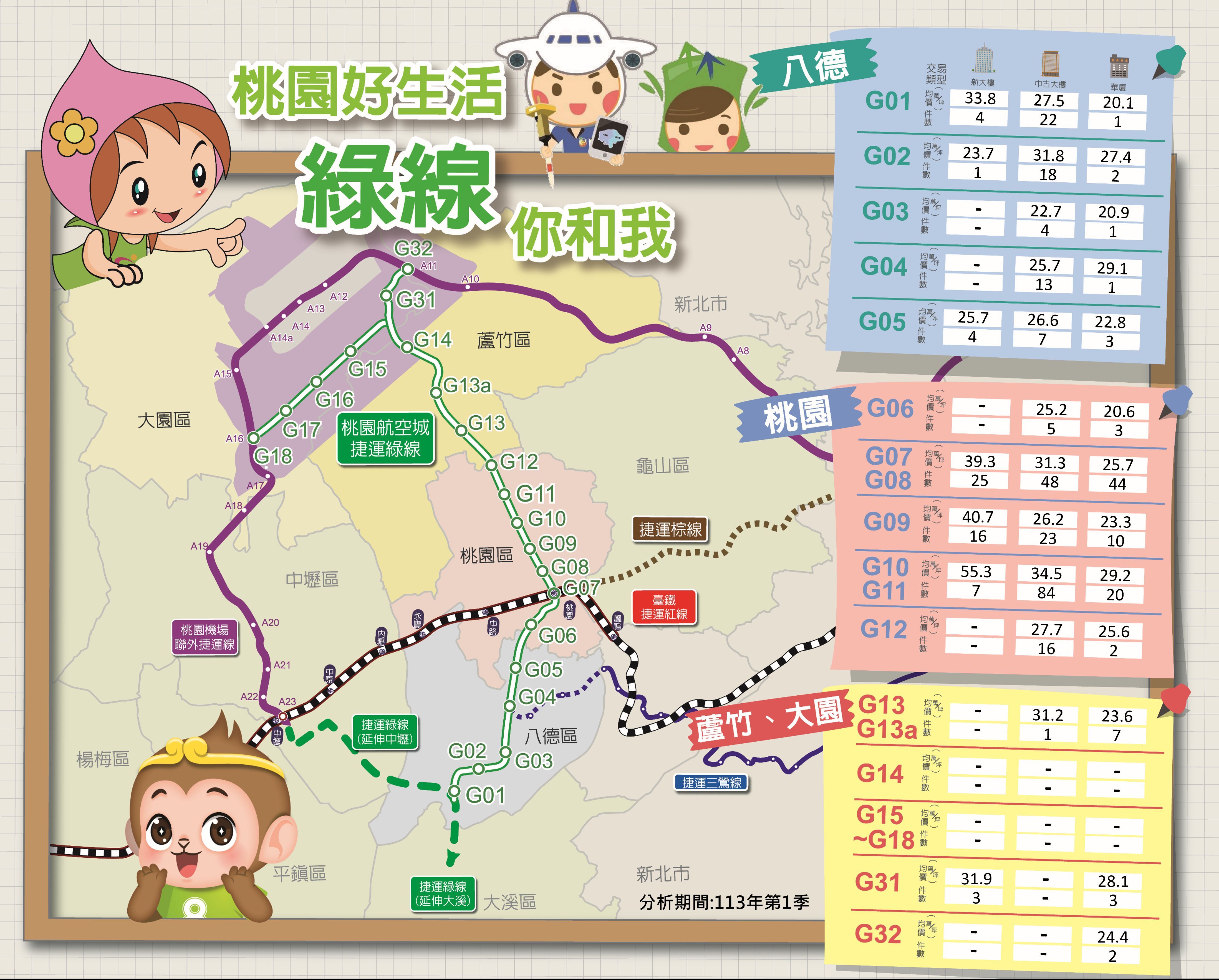桃園捷運綠線貫穿八德、桃園、蘆竹及大園等區,沿線各地政事務所攜手合作推出「桃園好生活,綠線你和我」,針對沿線21個站點周邊500公尺內之地區進行價量分析,113年第1季各建物型態(不包含1樓)均價比較說明如下: